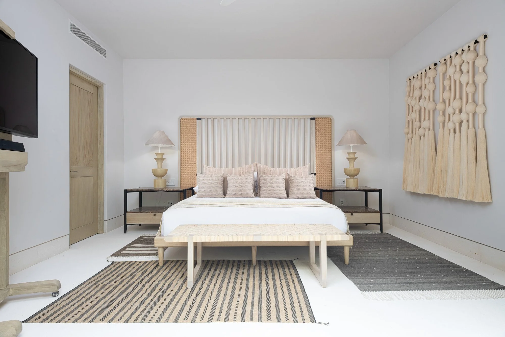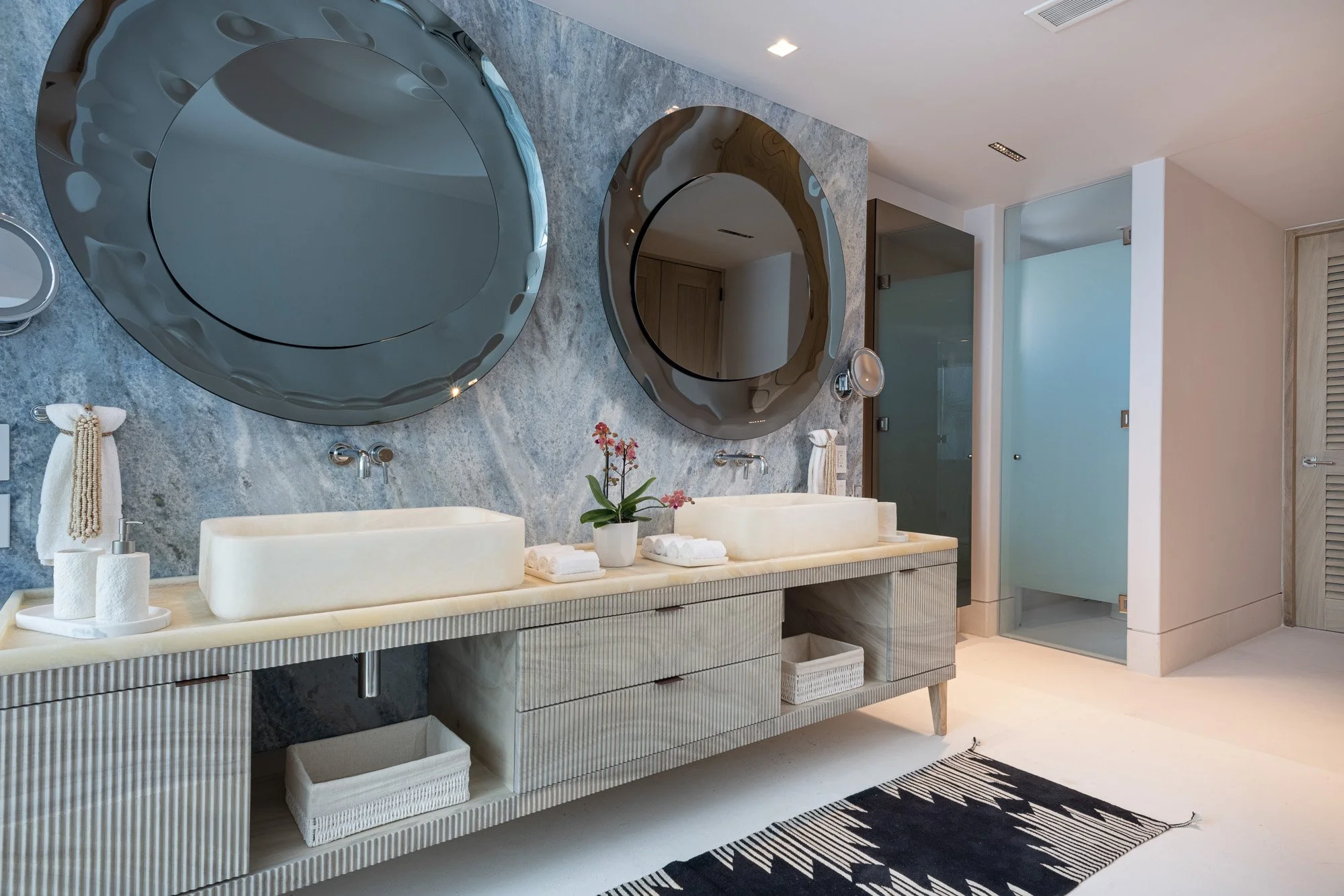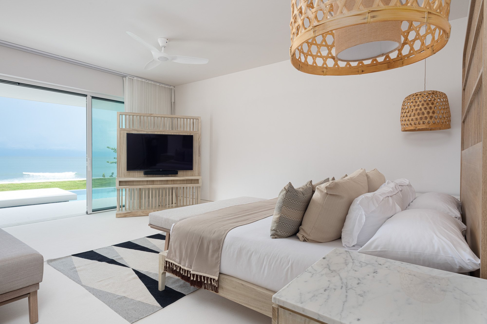 Casa Akai's bold design is complemented by soft, inviting details, creating a sense of tranquility. Massive sliding glass walls blend the exterior with the interior, infusing the home with sea spray and natural light. Sink into plush couches, unwind on warm chaise lounges, and find serenity on each terrace. Neutral interior tones calm, while unique ornamentation and Old World-inspired furnishings add a playful yet modern flair. Casa Akai, curated by Joaquin Homs, promises an extraordinary villa experience where every day feels like paradise.