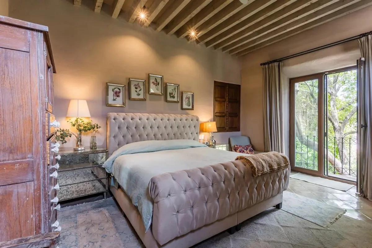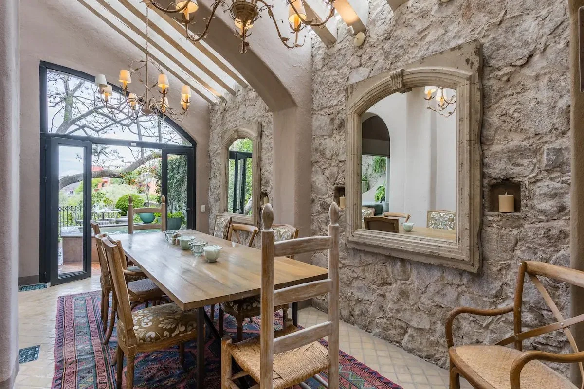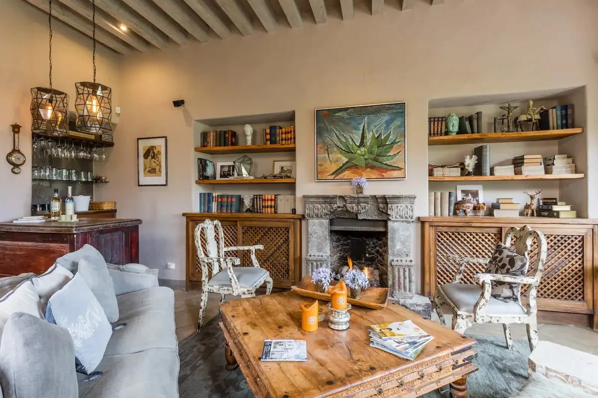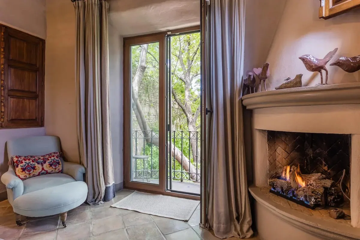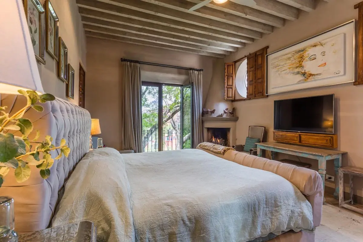 The beautifully appointed living room, complete with a gas fireplace and small bar, opens to a peaceful outdoor terrace with comfortable seating, a fire pit, and a jacuzzi—a perfect place for relaxed gatherings. The rooftop terrace provides sweeping views of San Miguel’s historic churches and vibrant landscape, while the lower-level garden terrace, featuring a fountain and cozy seating, offers an idyllic escape.