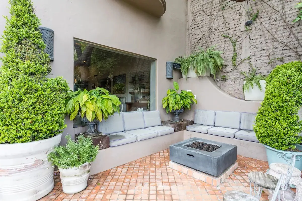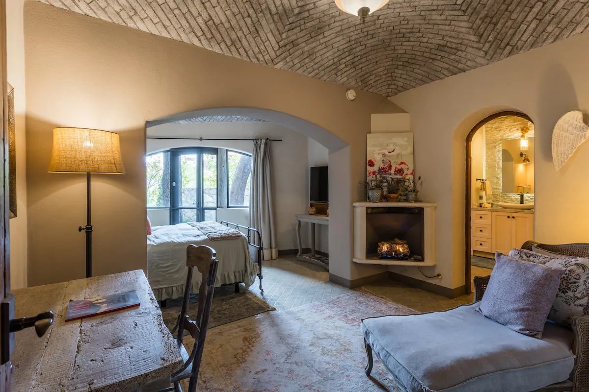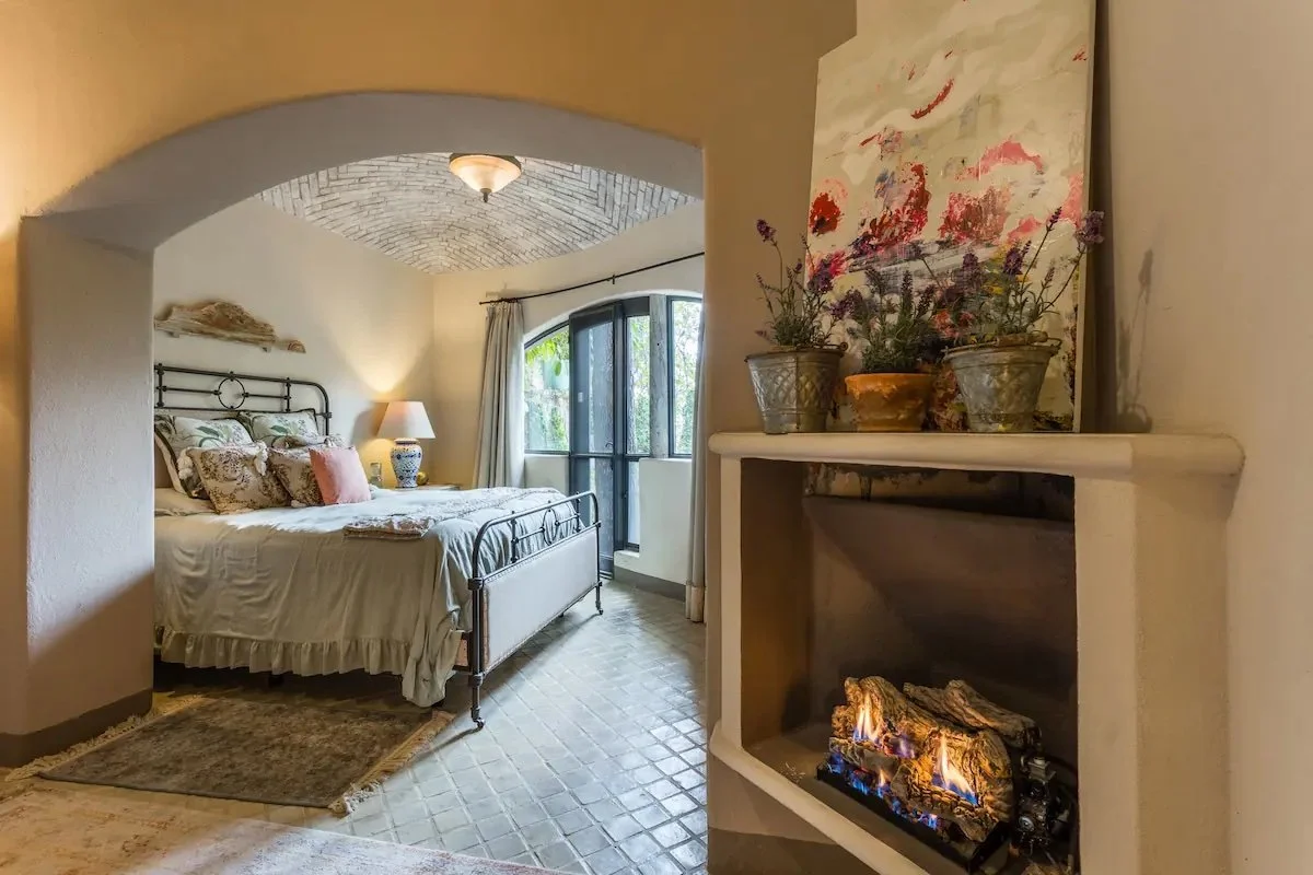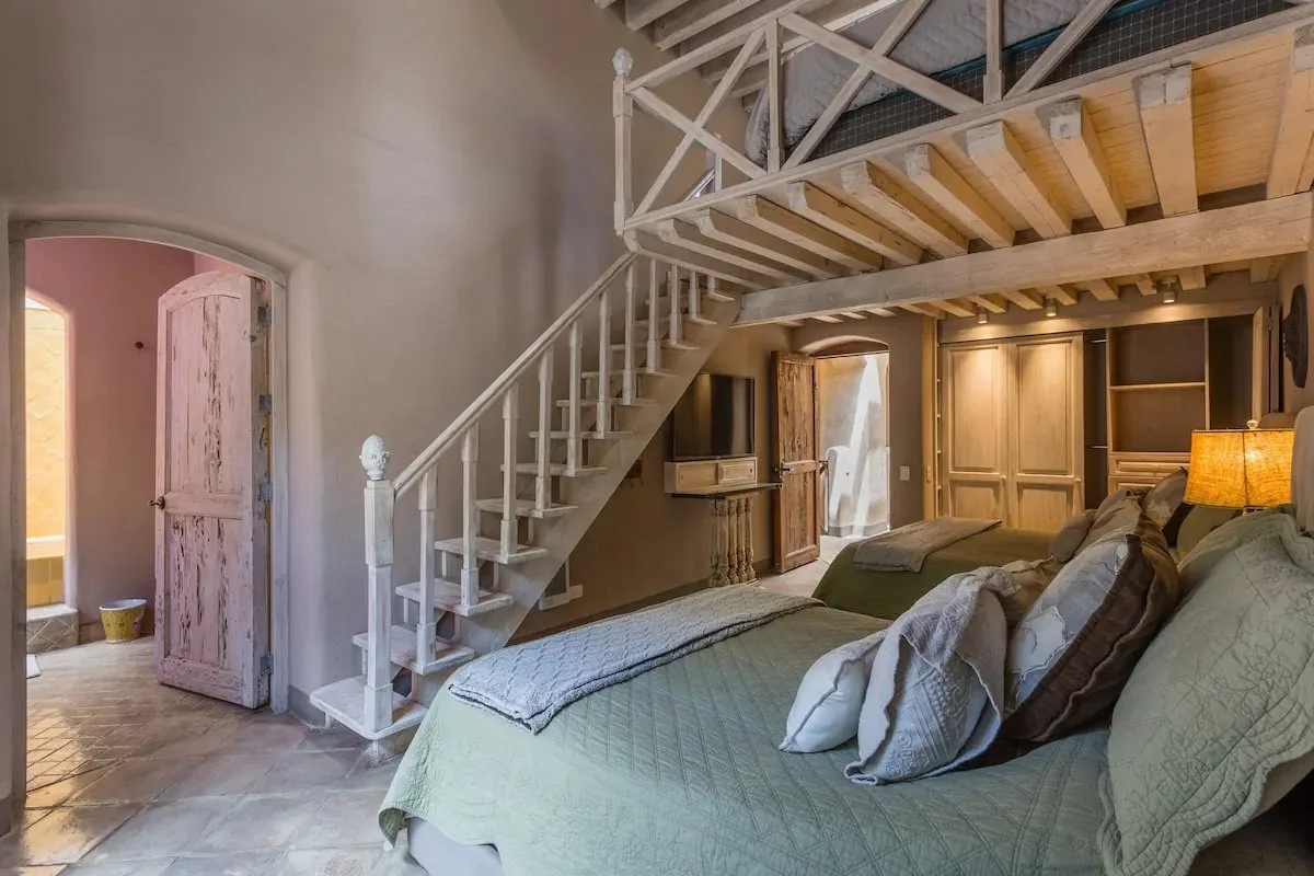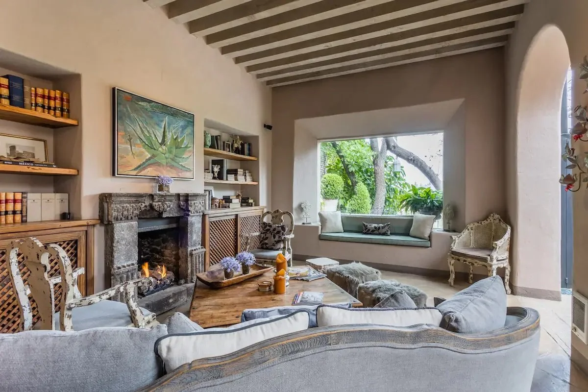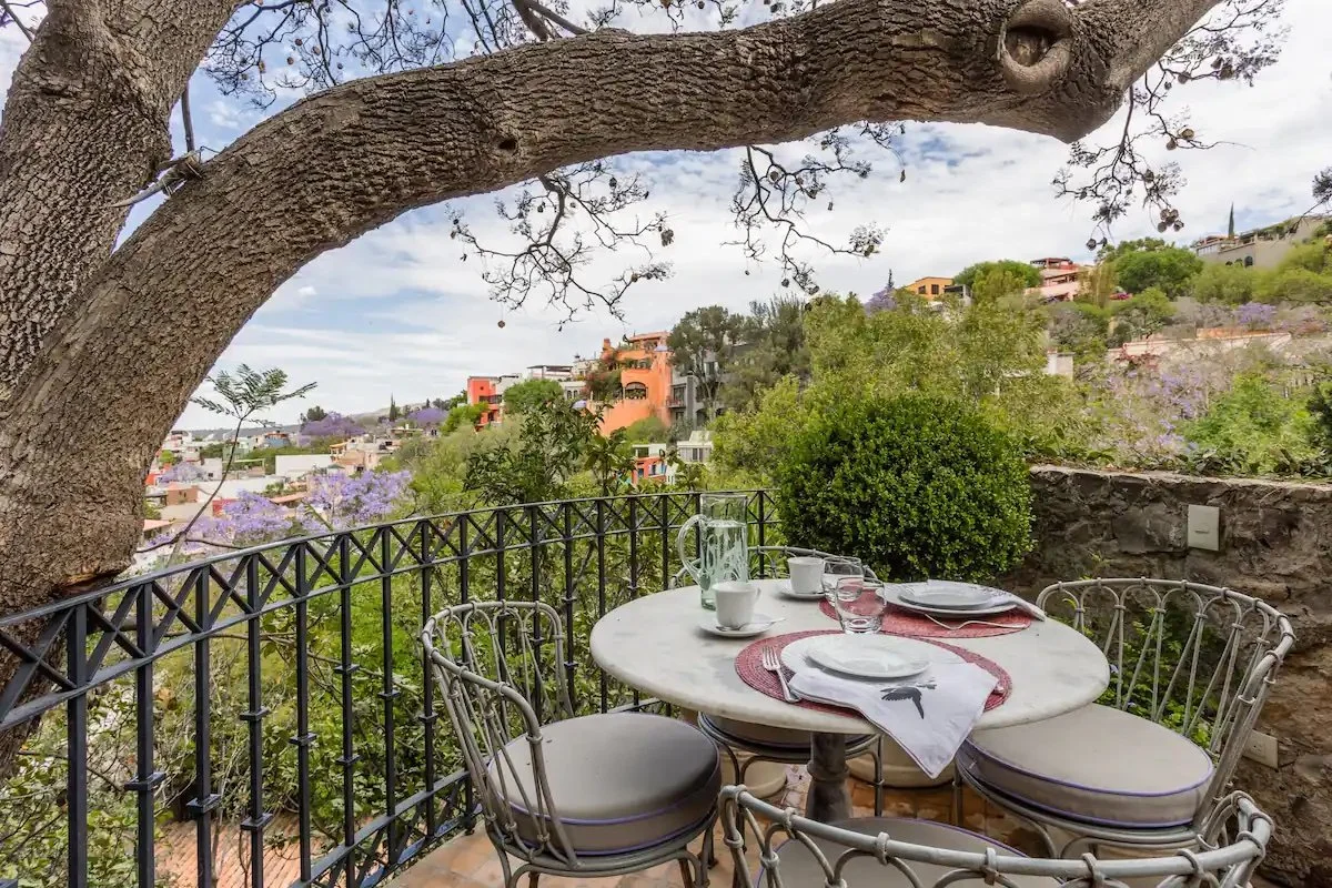 The beautifully appointed living room, complete with a gas fireplace and small bar, opens to a peaceful outdoor terrace with comfortable seating, a fire pit, and a jacuzzi—a perfect place for relaxed gatherings. The rooftop terrace provides sweeping views of San Miguel’s historic churches and vibrant landscape, while the lower-level garden terrace, featuring a fountain and cozy seating, offers an idyllic escape.