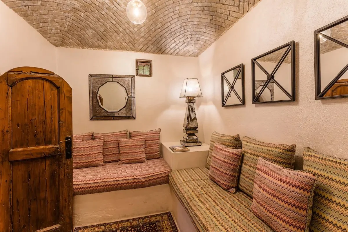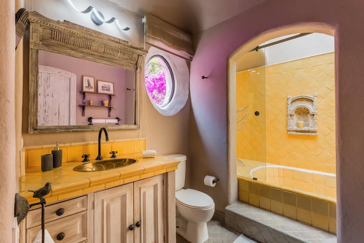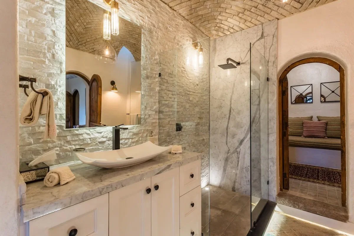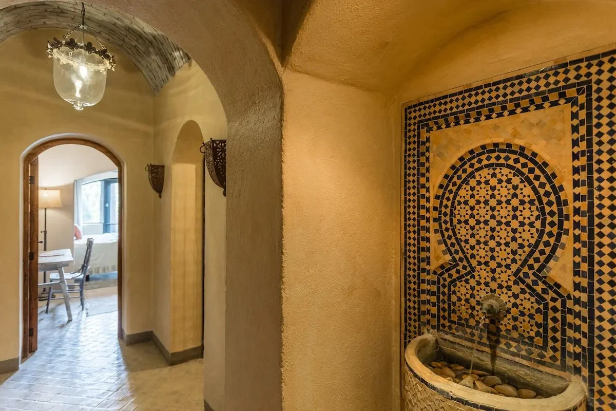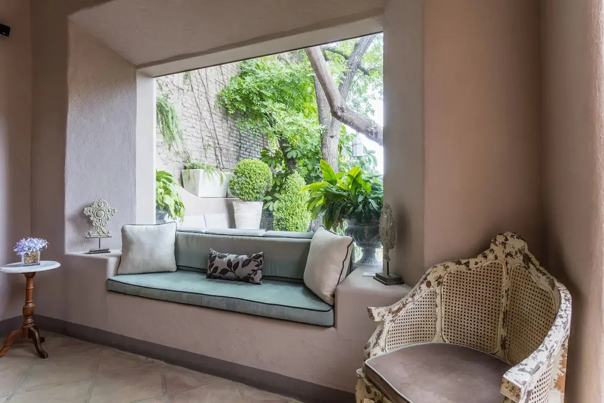 The beautifully appointed living room, complete with a gas fireplace and small bar, opens to a peaceful outdoor terrace with comfortable seating, a fire pit, and a jacuzzi—a perfect place for relaxed gatherings. The rooftop terrace provides sweeping views of San Miguel’s historic churches and vibrant landscape, while the lower-level garden terrace, featuring a fountain and cozy seating, offers an idyllic escape.